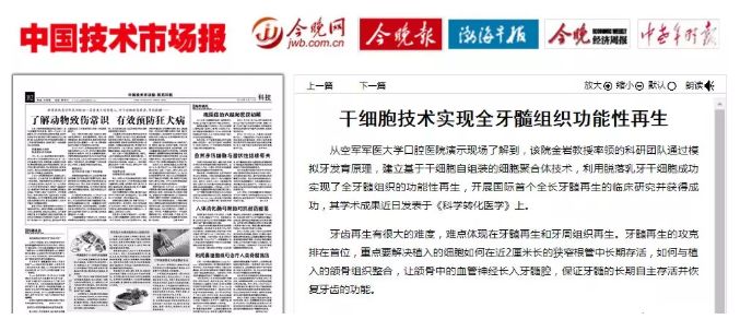 面对牙髓再生这一世界难题,空军军医大学口腔医院金岩教授率领的科研团队,历经20多年潜心努力,从患者脱落乳牙中获取牙髓干细胞。 经过体外培养,将形成的干细胞聚合体植入患者所需的牙髓腔里,使得牙齿神经血管再生,完全恢复牙齿原有功能。特别是对于牙齿正在发育的年轻患者,能使牙齿发育到正常状态。
