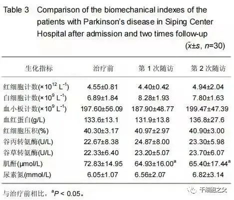 研究结果:30例帕金森病患者经过干细胞移植治疗无明显并发症,病情得到有效的缓解,尤其是强直、姿势、步态、震颤、面容方面改善较明显。