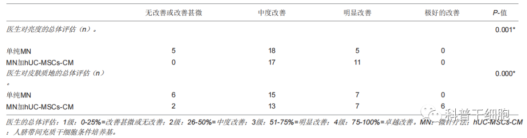 与单独使用微针相比,临床医师认为hUC-MSCs-CM加MN后的亮度和皮肤纹理的总体评价具有更大的改善(P表3)。