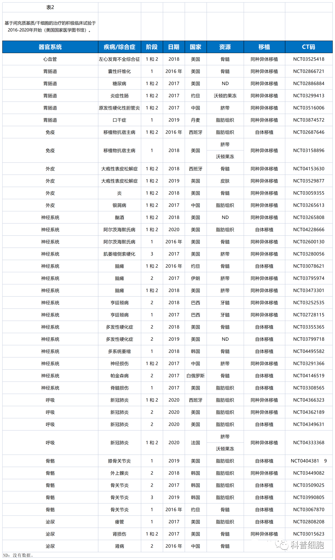 (除早期1期外的所有阶段,不适用)列于表1。表2和表3显示2016-2020年期间积极招募MSC治疗的临床试验(美国国家医学图书馆)。
