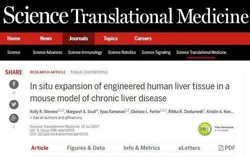 一项发表在《Science Translational Medicine》的研究中,研究人员将人类肝细胞(human hepatocytes)、成纤维细胞 (fibroblasts) 和内皮细胞索 (endothelial cell cords)以特定的排列模式嵌入到一种能够被生物降解的水凝胶骨架中。当这种人工制造的肝组织被移植到肝脏受损的小鼠腹腔中后,它们能够生成血管并且与小鼠的循环系统整合。同时这种人工肝脏组织能够对小鼠分泌的刺激肝脏再生的信号产生反应,导致血管生成并且促进肝细胞增殖。