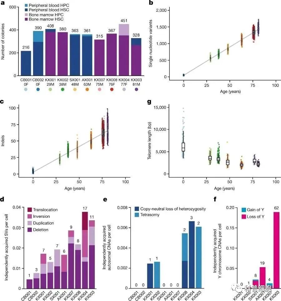 “体细胞突变学说”是众多衰老学说之一,该理论认为,突变引起的细胞形态变化及功能失调或丧失是人体衰老的重要原因。那么由体细胞突变导致的分子损伤,是如何在70岁后突然爆发的呢? 为探究这一衰老的过程,研究者分析了10名年龄分布在0-81岁(涵盖新生儿到老年人)的人类受试者个体,对他们体内的3,579个造血干细胞进行了全基因组测序,并确定了每个细胞中包含的所有体细胞变异。在此基础上,构建了各个体的造血干细胞“家谱”,首次客观地展现了血细胞之间的关系以及这些关系在人类一生中是如何变化的。 结果显示,出生后造血干细胞或多能祖细胞平均每年累积17个突变,端粒长度也会随着年龄增长而稳步下降,在成年后每年平均损耗30.8个碱基对。以18岁成年来计算,古稀之年的老人造血干细胞共积累了近900个突变,端粒长度损失了1601.6个碱基对。