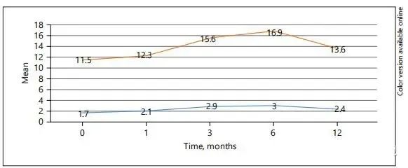 随着时间的推移,EHS评分也显著提高。基线时,平均得分为1.7±0.7。在干细胞治疗后6个月达到最高分(3 ± 0.8)(p