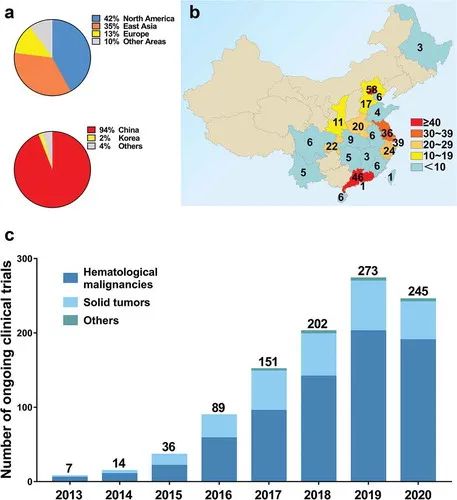 截止2020年6月9日,中国有334项CAR-T临床试验,占94%,这些试验主要在北京(58家)、广东省(46家)、上海市(39家)、江苏省(36家)和浙江省(24家)。从2013年到2020年,CAR-T治疗血液学和实体癌的试验数量大幅增加。