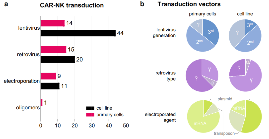 在临床前研究中,21项研究使用了第二代病毒,6项研究使用了第三代慢病毒来产生表达CAR的NK细胞系(17个未知)。在原代CAR-NK细胞研究中,5项研究使用了第三代慢病毒,7项研究使用了第二代慢病毒载体(2个未知)。