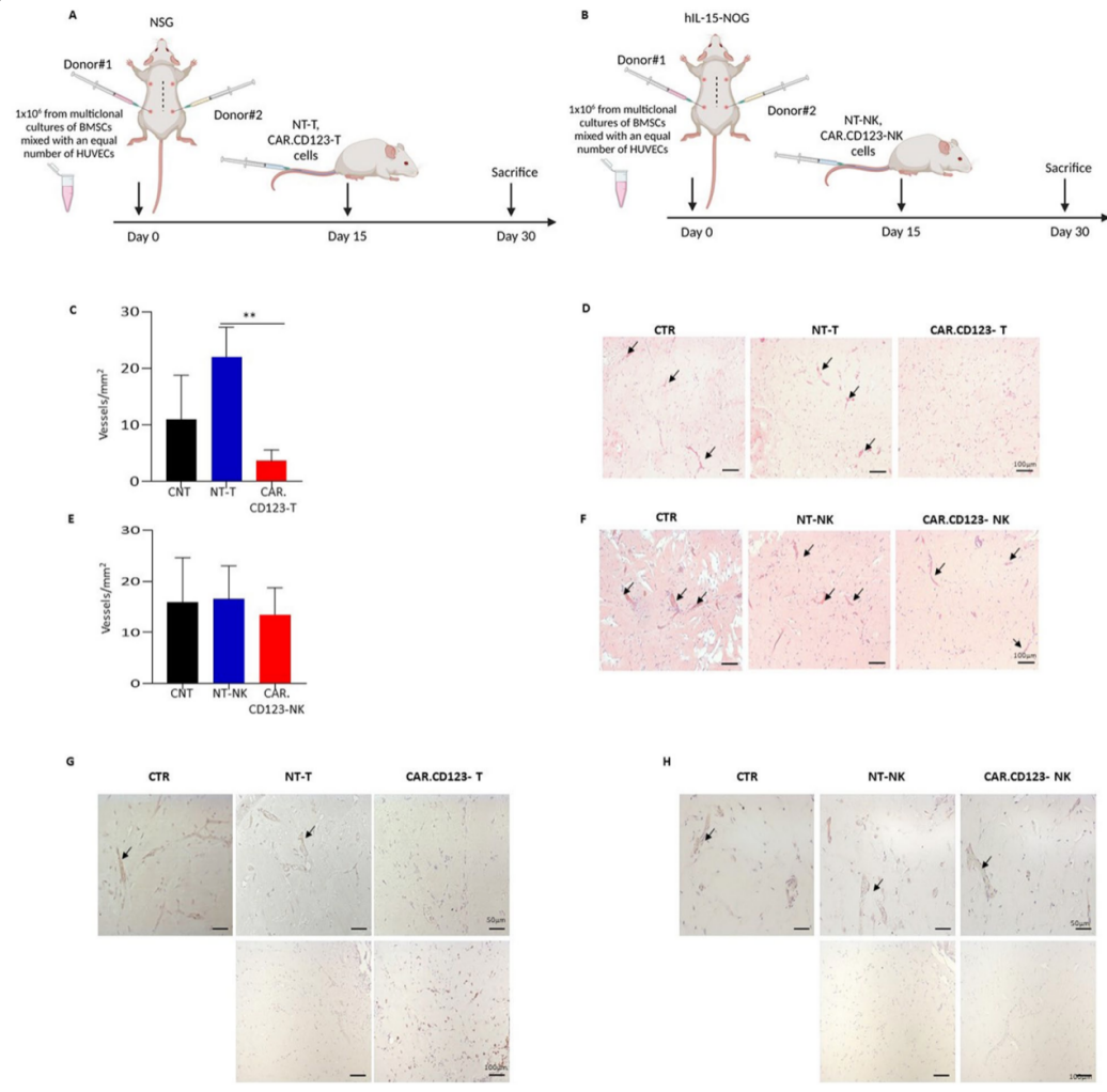 而在人内皮组织的验证模型中(人内皮细胞上CD123也有表达),该研究首次证实和CD123-CAR-T细胞疗法相比,CD123-CAR-NK细胞治疗不会对人源化小鼠模型或人内皮小鼠模型产生内皮损伤,治疗更加安全。