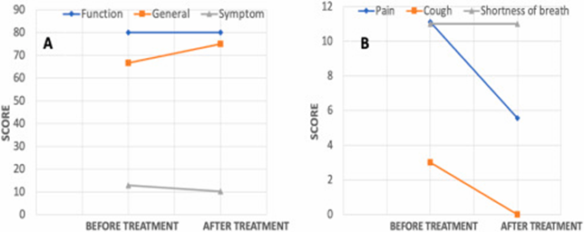 图5。评估治疗前后患者的生活质量。A、 生活质量:患者总体情况好转,症状急剧下降。B、 功能症状:6次输注后患者的疼痛和咳嗽明显下降。[2]