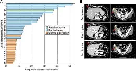 在I期研究中,22名患者中有12人疾病稳定(SD);其中7名受试者的SD持续到第4周期。