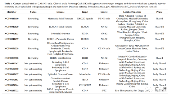 Clinicaltrials.gov 目前有 6 个 CAR-NK 细胞试验被列为积极招募和 6 个尚未积极招募的早期 I 期临床试验(表 1)。虽然许多试验侧重于淋巴瘤和白血病,但其他试验则针对实体肿瘤,包括卵巢癌、前列腺癌、脑癌、肝癌、肺癌和胰腺癌。