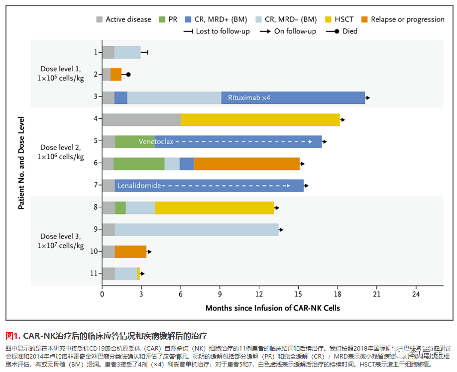 前9例患者接受了与受者HLA基因型部分匹配(在HLA位点A、B和DRβ1,6种HLA分子中的4种匹配)的CAR-NK产品(表1和补充附录表S1)。之后我们对试验方案进行了修订,允许在不考虑HLA是否匹配的情况下进行治疗;患者10和11的治疗中采用了该操作。在可能的情况下,我们选择了杀伤性免疫球蛋白样受体(KIR)配体不匹配的一个单位脐带血来制备CAR-NK(供者和受者之间的KIR不匹配有可能通过称为缺失-自我识别的过程来增强NK细胞的固有[非CAR介导的]抗肿瘤活性)。我们依据2018年国际慢性淋巴细胞白血病研讨会标准和2014年卢加诺非霍奇金淋巴瘤分类法确定患者对治疗产生的应答。