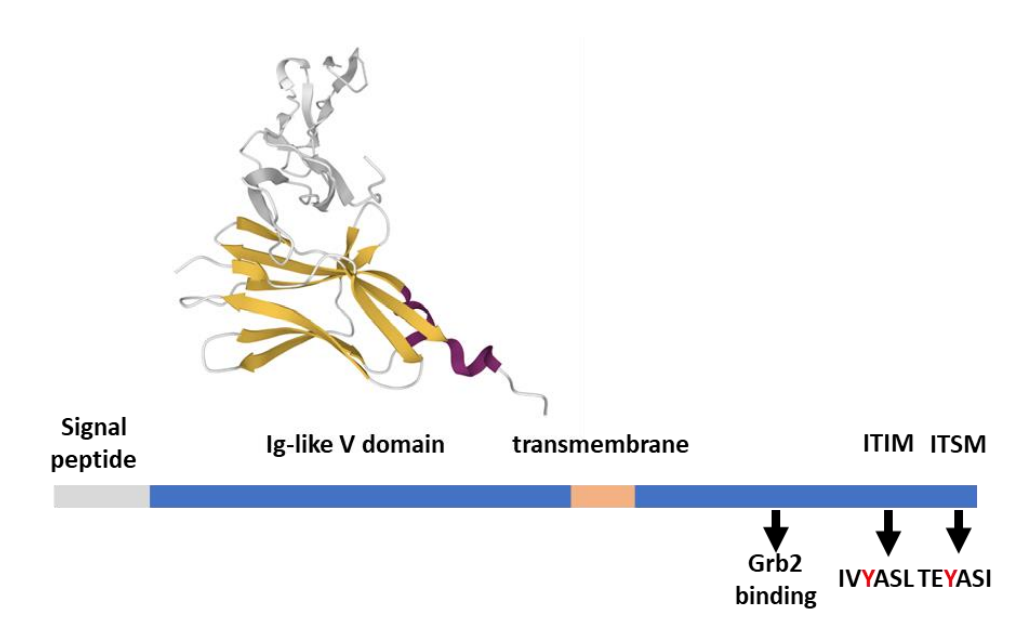 PD-1(CD279)受体是I型跨膜糖蛋白,属于CD28受体超家族成员。但与CD28不同,它在细胞表面是单体。在结构上,PD-1由细胞外免疫球蛋白可变结构域、跨膜结构域和负责信号和骨架分子结合的细胞质尾部组成。PD-1的细胞质尾部包含两个酪氨酸基序,一个ITIM(VDY223GEL)和一个ITSM(TEY248ATI)。两个结构域在PD-1配体结合时通过Lck的酪氨酸激酶活性磷酸化。