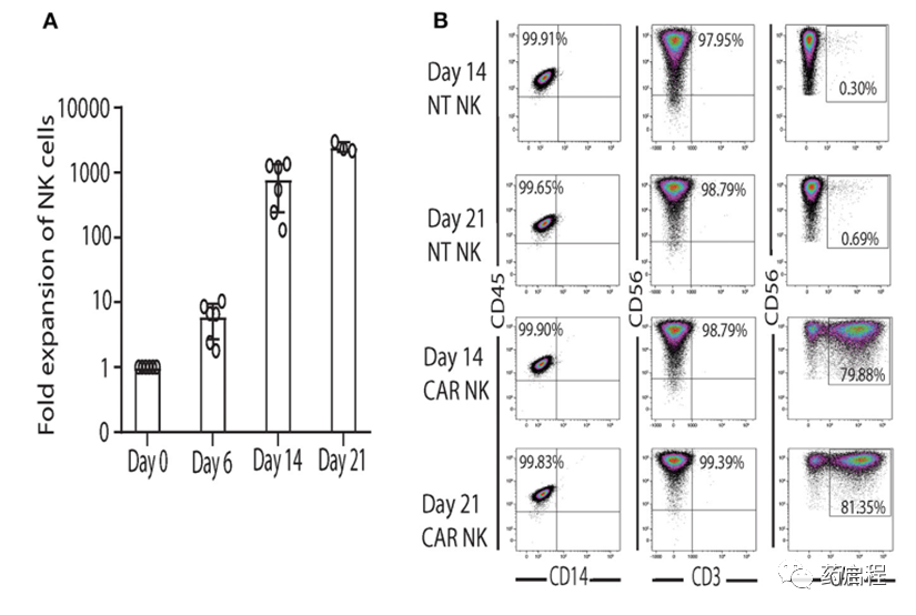 健康的人类外周血,通过密度梯度离心分离CB和外周血单核细胞(PBMC)。使用NK分离试剂盒纯化CD56阳性NK细胞,并用辐照(100 Gy)uAPC(饲养细胞与NK细胞的比例为2:1)和重组人IL-2在第0天在完全无血清干细胞生长培养基(SCGM)中。