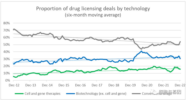 虽然我们预计 CGT 领域将继续扩大,并以风险投资、并购和公共投资的形式重新进行融资,但随着经济和地缘政治不确定性的显现,2023 年交易活动可能仍将低迷。许多投资者和买家正在寻找处于后期临床阶段的公司和目前市盈率较低的低风险资产,以及需要现金注入的机会主义目标。 从许多 CGT 领导者的角度来看,如果他们能够坚持里程碑并管理好他们的现金跑道(许多人在大流行期间得到了流动资金和高估值的支持),他们应该能够安然度过目前交易匮乏的情况。对于那些不能或决定风险投资或公开市场之外的替代资本来源对他们有利的人,他们应该受到大型生物制药同行持有的大量资金的鼓舞。30 家最大的生命科学公司在大流行期间积累了数百亿美元的资金,其中许多公司正在研究“老化”的管线,未来五年内有数十亿美元的潜在销售额将失去专利。 我们预计这将刺激战略企业参与者确定收购或合作伙伴关系,以实现管线现代化,并为未来的研发提供技术加速器。细胞和基因疗法无疑是该计划的重要组成部分,随着越来越多的 CGT 获得积极的临床结果并获得 FDA 批准,我们还将看到人们对传统药物和生物技术公司的偏好更加迅速地转变。使用药品许可交易作为代理,在过去十年中,CGT占所有许可交易的比例从 5% 上升到 15%(生物技术从 23% 上升到 33%,传统技术从 72% 下降到 52%)。