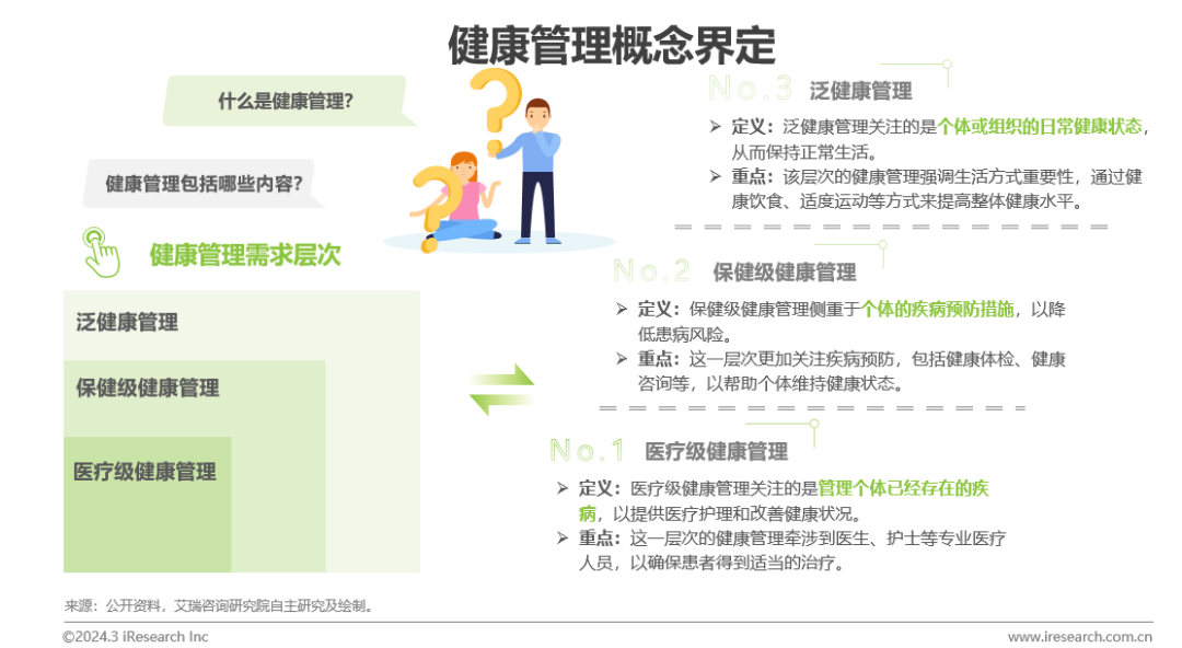 概念剖析:健康管理是指对健康人群/患者健康进行监测、分析和评估,对健康危险因素进行干预,控制疾病发生、发展,保持健康状态的行为。其核心价值在于将健康维护的重点从治疗和康复向疾病的预防前移。