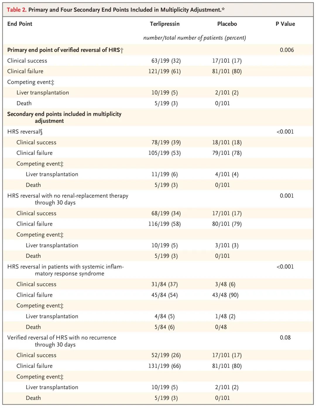FDA 的批准部分基于3期 CONFIRM 试验的结果,这是美国和加拿大有史以来最大的前瞻性研究 (n=300),旨在评估特利加压素在 HRS-1型 (HRS-1) 患者中的安全性和有效性。CONFIRM 试验满足其主要终点验证的 HRS 逆转,定义为肾功能改善、避免透析和短期生存 (p=0.012)。为了实现可验证的 HRS 逆转,患者必须有两个连续的血清肌酐 (SCr) 值≤1.5 mg/dL,且在第14天或出院前至少间隔两个小时。为了纳入主要疗效终点分析,患者必须在达到经证实的HRS逆转后至少 10天内存活,且没有进行干预性肾脏替代治疗(如透析)。初步结果在2019年 AASLD年会肝脏会议 (the Liver Meeting®2019) 的最新会议上公布。研究结果也于2021年3月发表在《新英格兰医学杂志》上。CONFIRM 试验是在2021年 AASLD肝肾综合征指南发布更新的诊断标准和术语之前完成的。
