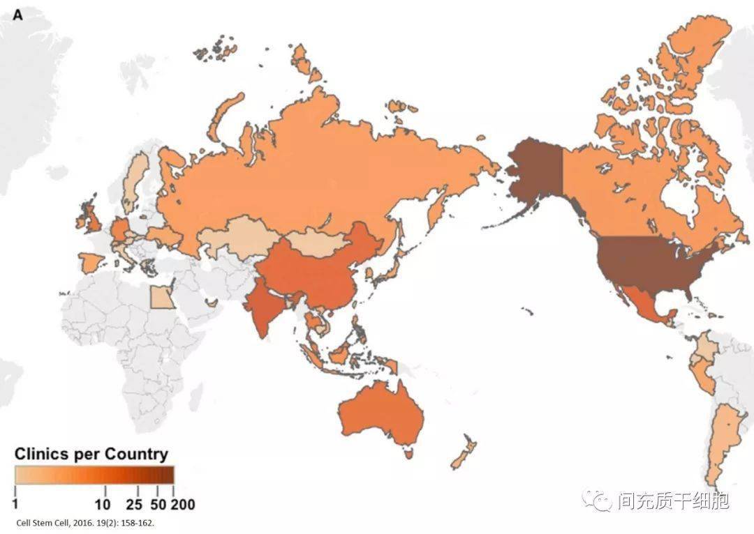 全球干细胞诊所的分布示意图如下(2016年的统计数据)