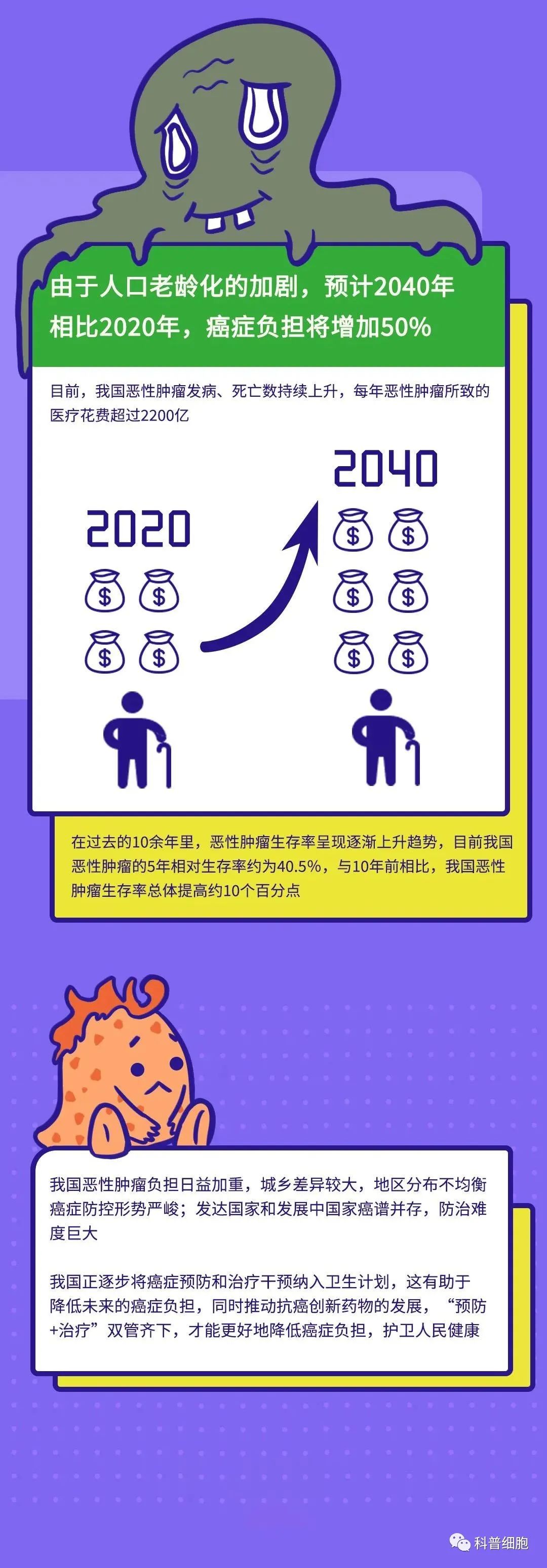 由于人口老龄化的加剧,预计2040年相比2020年,癌症负担将增加50%。目前,我国恶性肿瘤发病、死亡数持续上升,每年恶性肿瘤所致的医疗花费超过2200亿。
