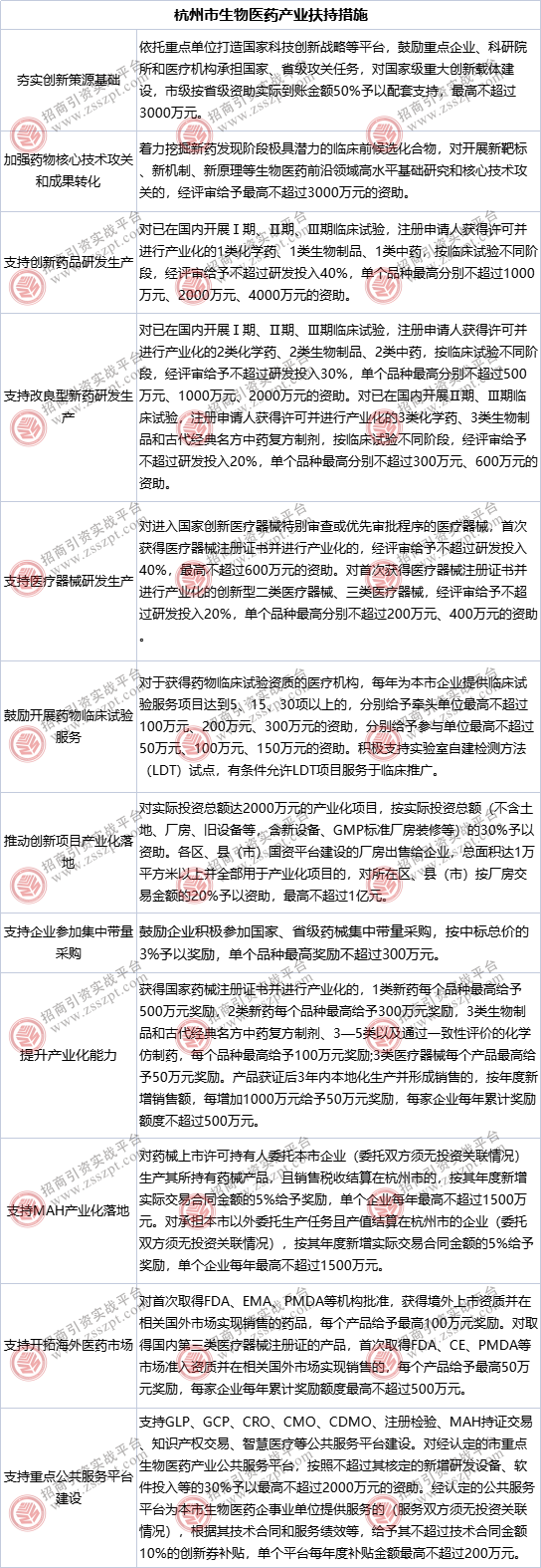 05 杭州市 产业概况 生命健康产业是杭州重点打造的五大产业生态圈之一。2022年,全市生物医药规上工业企业240家,工业总产值1150亿元,同比增长17.3%。杭州钱塘新区作为浙江省首个省级新区和杭州市生物医药产业发展的核心区,目前已集聚生物医药企业1600余家,全球十大知名药企有7家落户。2022年,钱塘生物医药产业营收突破500亿元,占全市近一半;特别是钱塘区主导发展生命健康产业的功能平台——杭州医药港,已发展成为全省唯一集“万亩千亿”新产业平台、省级特色小镇、全省生物医药与医疗器械产业集群核心区于一体的产业功能区。 从产业布局来看,杭州生物医药产业已经形成“一核四园多点”的空间规划:钱塘区布局生物医药全产业链;高新区(滨江)重点发展高端医疗器械和创新药研发等领域;萧山区重点发展生物医药 CDMO、高端医疗器械、数字医疗等领域;余杭区重点发展医疗器械、创新制药、AI 医疗等领域;临平区重点发展医疗器械、创新制药等领域;临安区以天目医药港为核心,瞄准特色原料药、重点化学药物及生物技术药物等项目,推进生物医药特色发展。 扶持措施