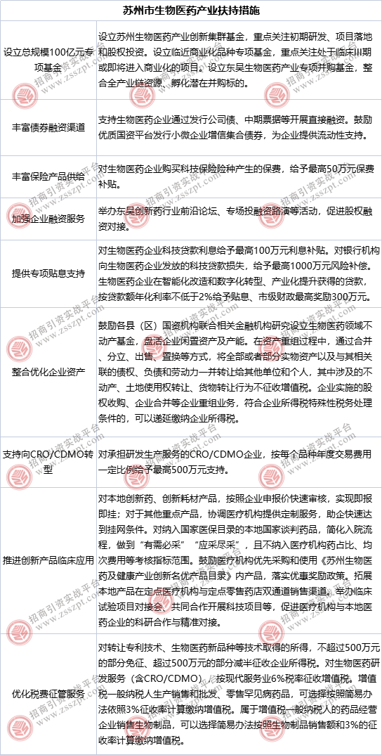 04 苏州市 产业概况 生物医药产业是苏州的“一号产业”,在创新医药和高端医疗器械等方面都具有极强的竞争力。截至目前,国家药监局已批准202个创新医疗器械产品,其中所在地为江苏的创新医疗器械共有27个,占比13.36%;所在地为苏州的创新医疗器械共有20个,占江苏全省创新产品74.07%,占全国9.90%。苏州已集聚生物医药企业超3800家,拥有规上企业569家,2022年规上产值达2188亿元,5年产值规模翻番,与北京、上海、深圳同列全国第一方阵。全市共4个产业园区入围全国生物医药产业园区50强,数量全省第一。全球医药10强中5家、医疗器械10强中5家均在苏落户。2022年年底,工信部公布的45个国家先进制造业集群名单,苏州生物医药及高端医疗器械集群入围,正式跻身“国家队”。 从产业布局上来看,苏州明确了“做强两核、做大多极”的区域布局,“两核”即为苏州工业园区和苏州高新区,苏州工业园区重点发展创新药物、生物技术及新兴疗法和医疗器械三大产业集群,苏州高新区重点发展体外诊断、生物医用材料和植介入器材、医学影像设备、治疗设备、康复类医疗器械等五大细分领域;多级即立足现有产业基础、创新基础和空间分布,系统谋划吴中诊断检测及医药加速基地、昆山小核酸及生物医药产业基地、太仓医药生产性服务业基地、常熟创新化药和手术设备基地、张家港骨科材料特色基地、相城智慧医疗及治疗设备基地、吴江特色药研发基地。 扶持措施