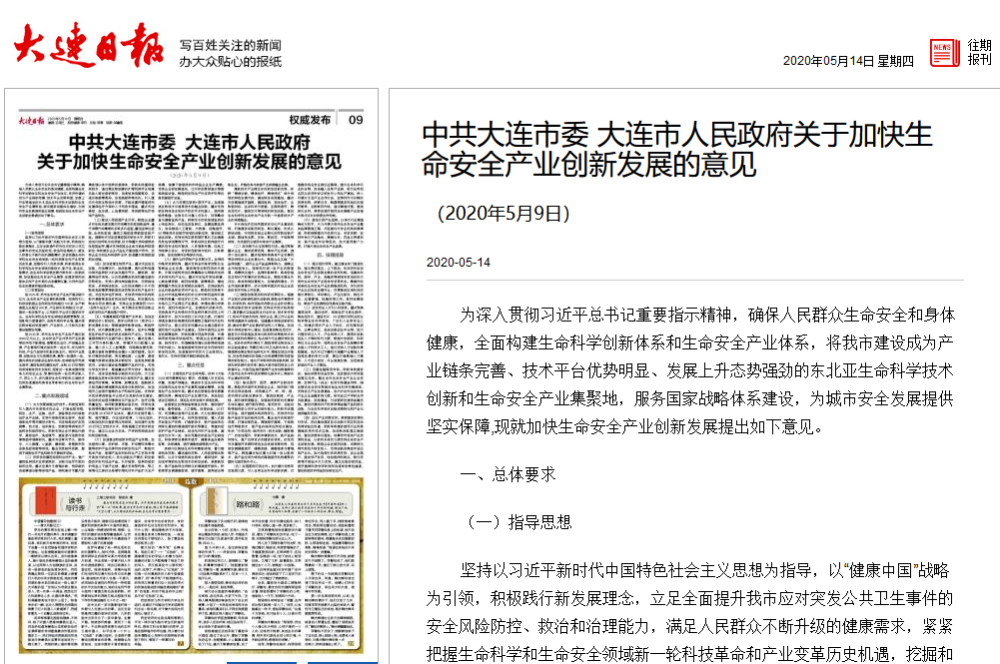 大连市政府发布《关于加快生命安全产业创新发展的意见》