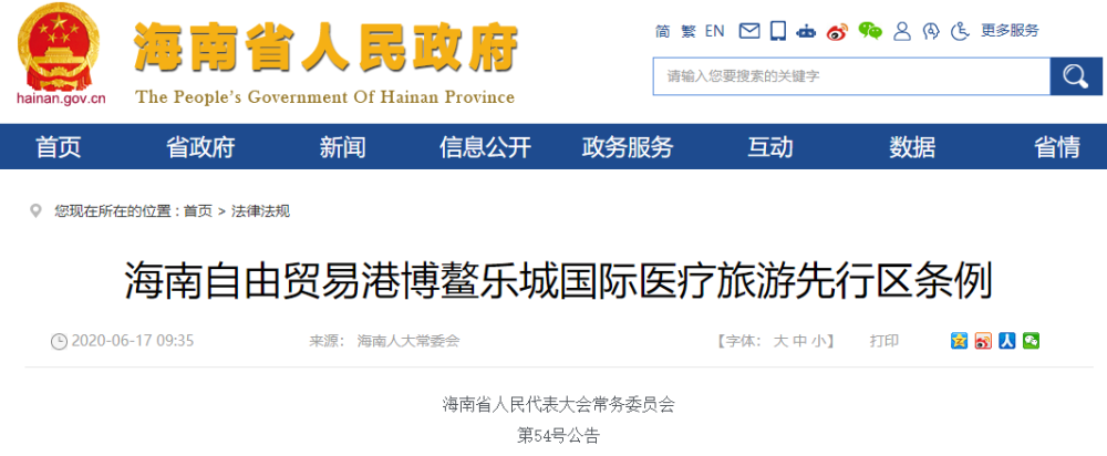 6月17日,海南省人民政府官网正式全文发布《海南自由贸易港博鳌乐城国际医疗旅游先行区条例》。